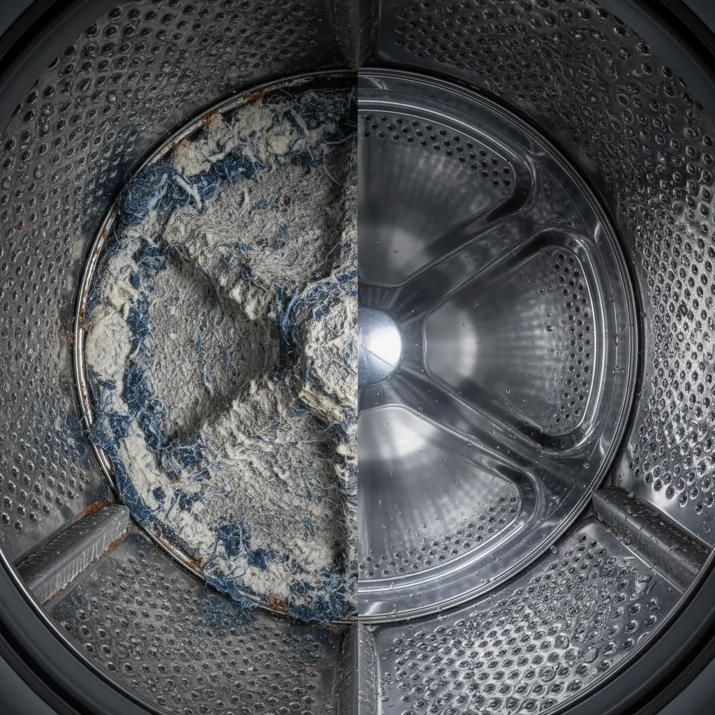 Soap scum, mineral deposits, and lint accumulate inside washing machines. This buildup creates odors, reduces cleaning effectiveness, and can damage machine components over time.
