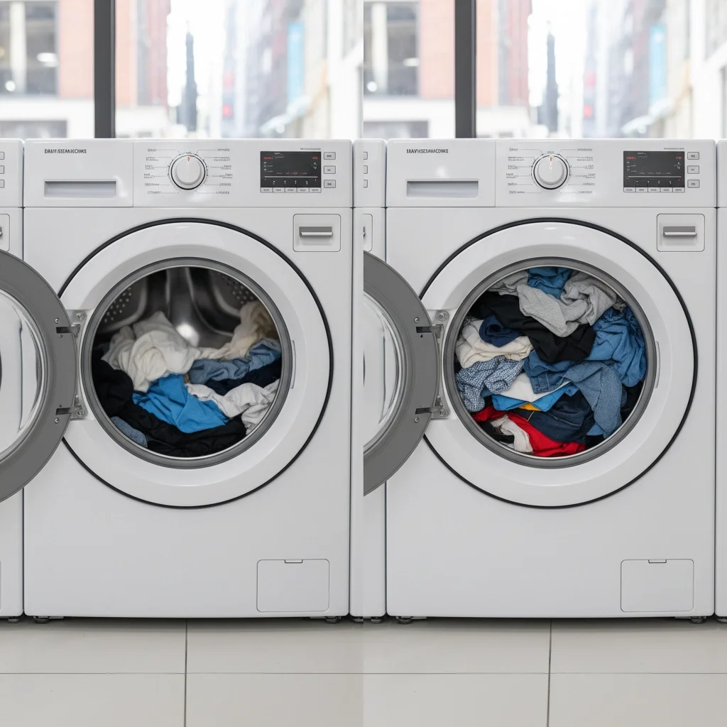 Overloaded washers cannot circulate water properly. Clothes remain bunched together, preventing adequate cleaning. Overloaded dryers extend drying times and create wrinkles from insufficient tumbling space.